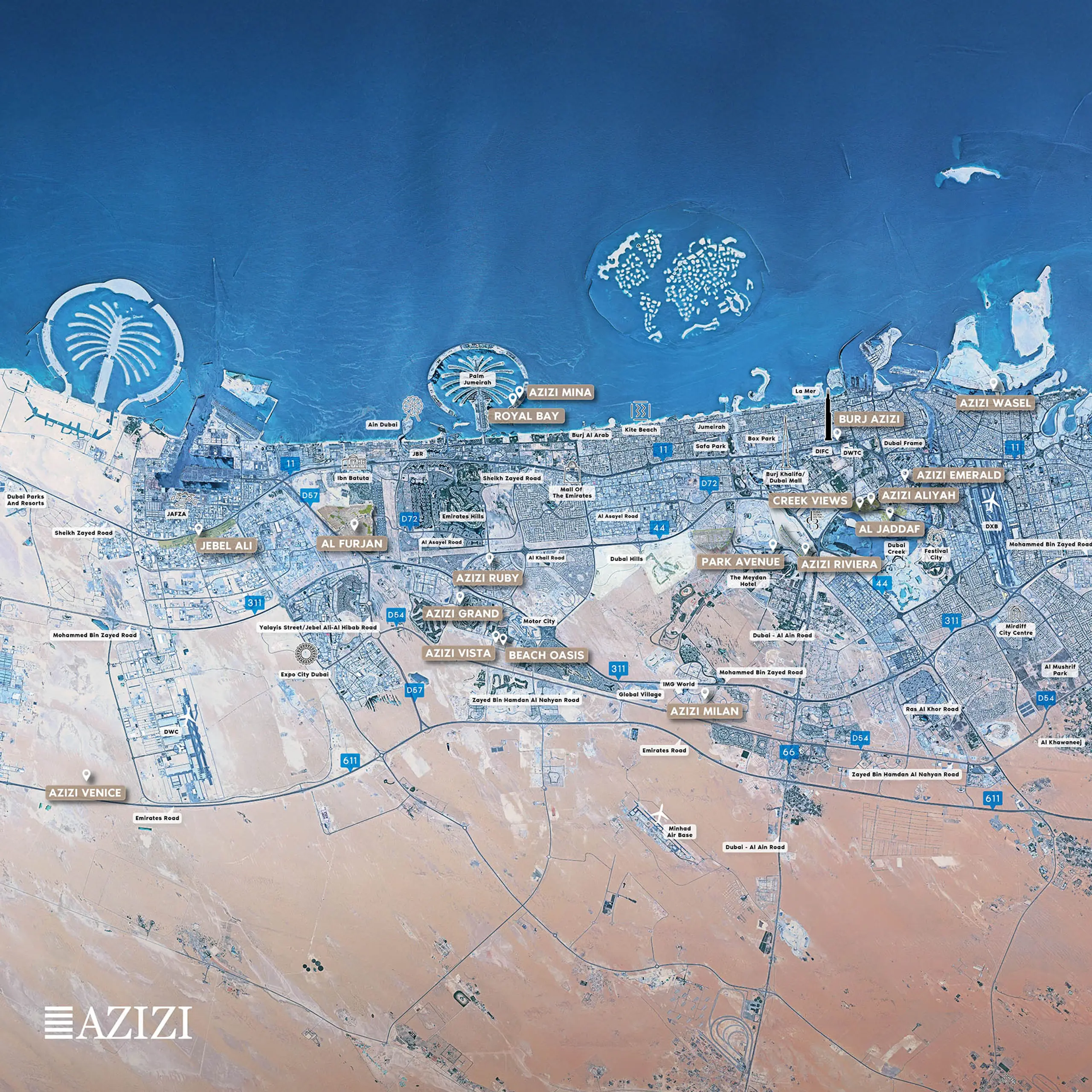 Azizi projects are located in Dubai’s most important areas, such as Al Jaddaf, Meydan, Dubai South, Dubai Land, Jebel Ali, and other prime districts selected for living and investment.